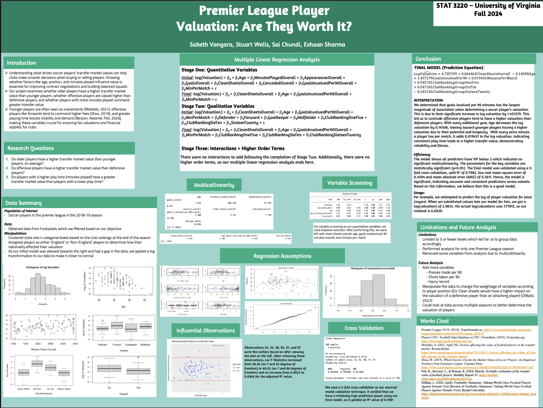 This was a multiple linear regression analysis conducted to study age, position, minutes played overall, and other variables to determine which would be significant predictors of a player's valuation following the 2018-2019 Premier League season.