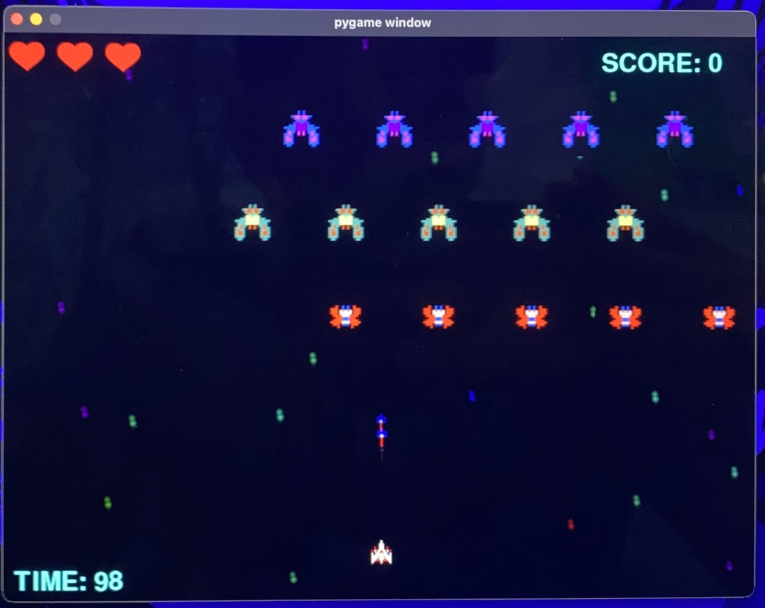 This is a scaled recreation of the original Galaga, a fixed-shooter game where the objective is for the user to defeat all the enemies without losing all of their lives and/or running out of time. It was implemented using Python and the UVA Game Engine library (UVAGE).